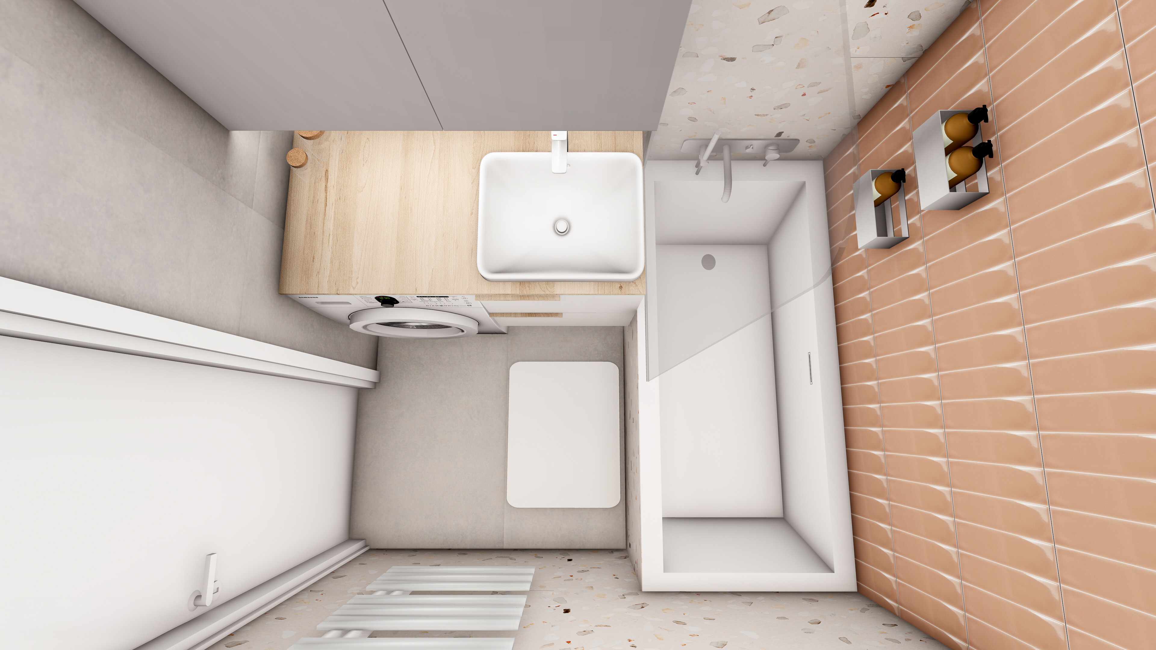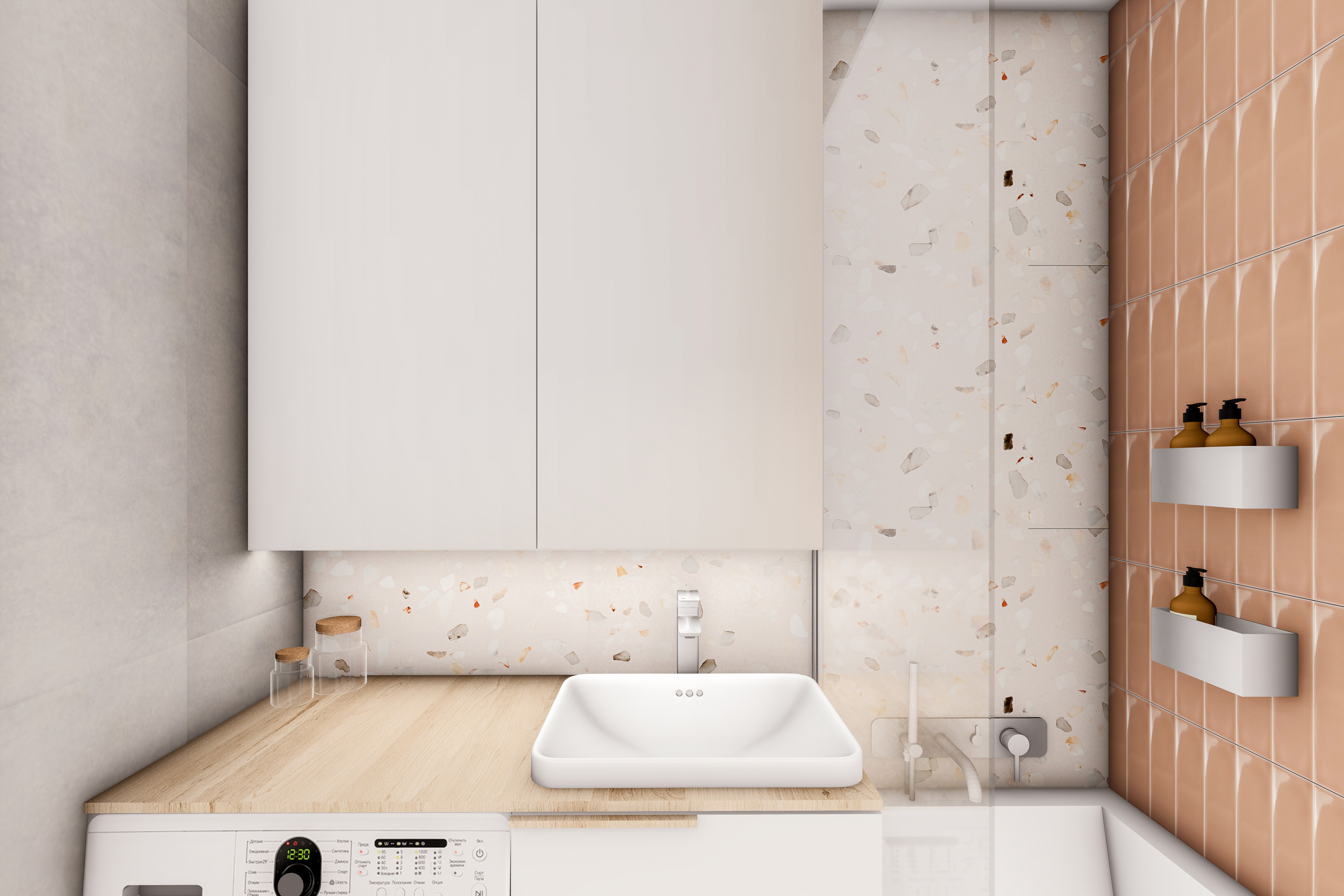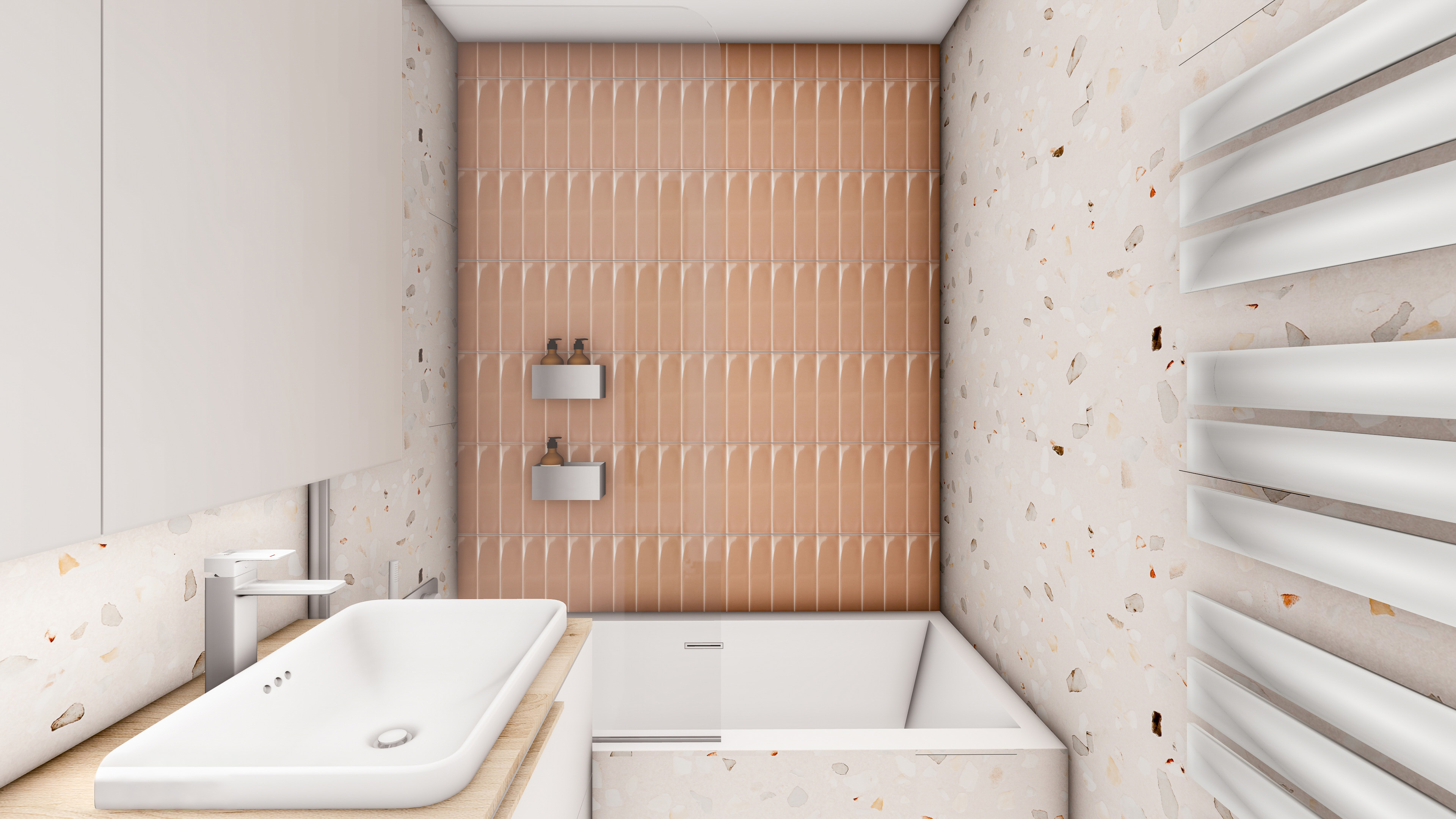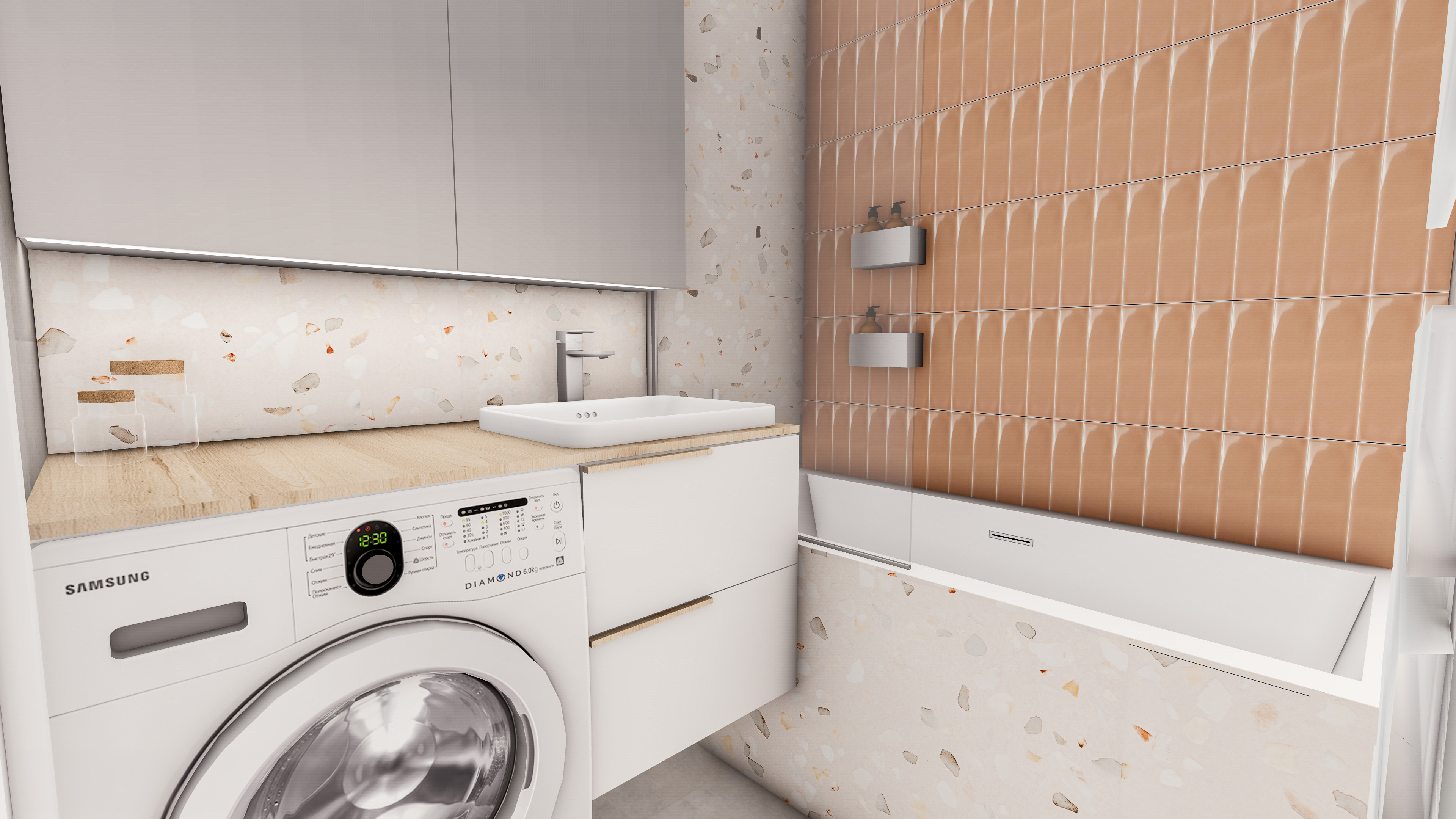 Do maličké koupelny, která měří pouze 1,5×1,8 m se podařilo poskládat vše potřebné, a to včetně pračky, která se sem v původním stavu nevešla. Pro maximální využití a optické zvětšení už tak malého prostoru jsem navrhla koupelnové skříňky na míru a barevnou stěnu, která prostor opticky rozšiřuje. Kromě barevného obkladu je zde moderní terazzo pro veselou atmosféru celé místnosti.