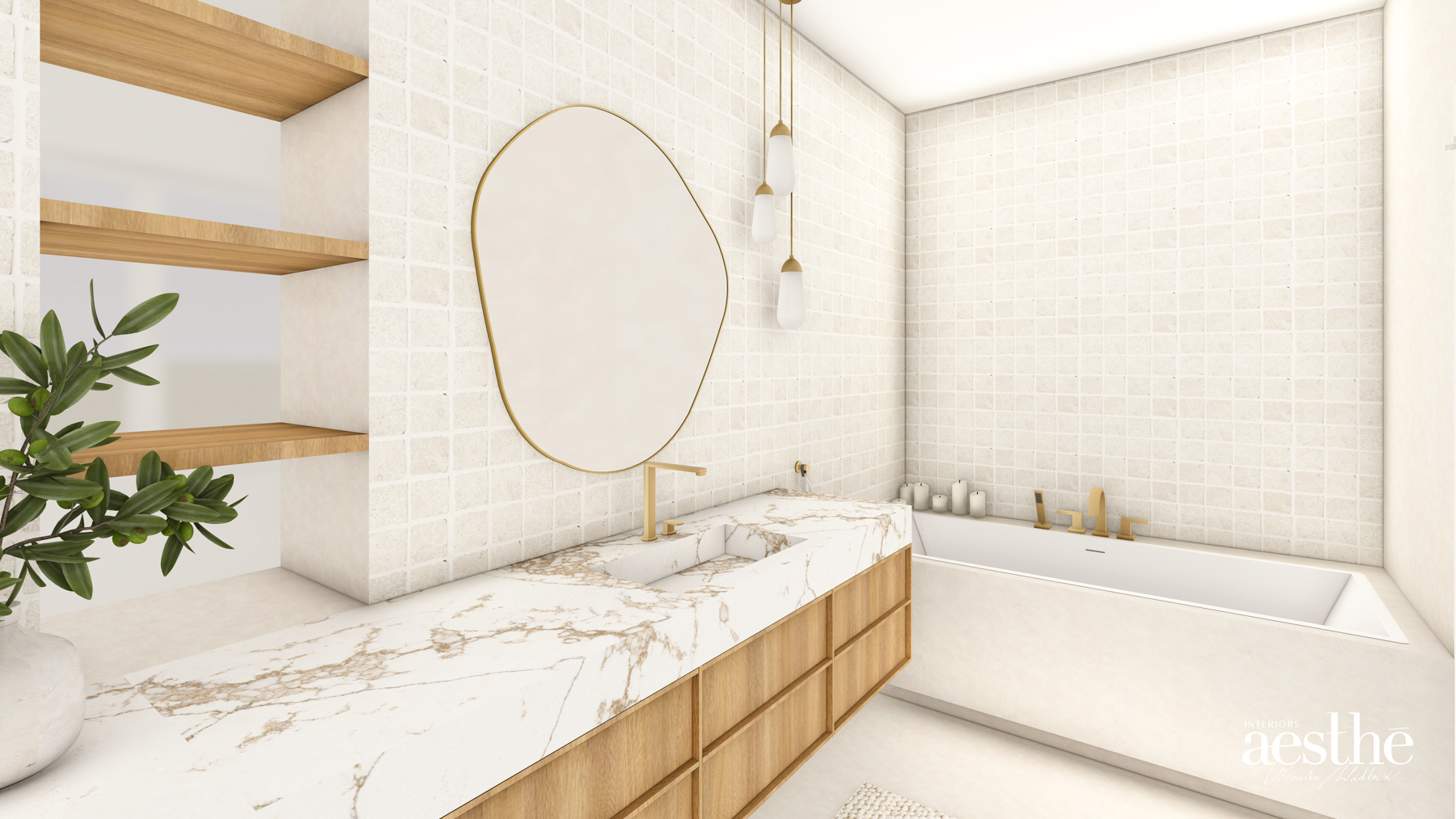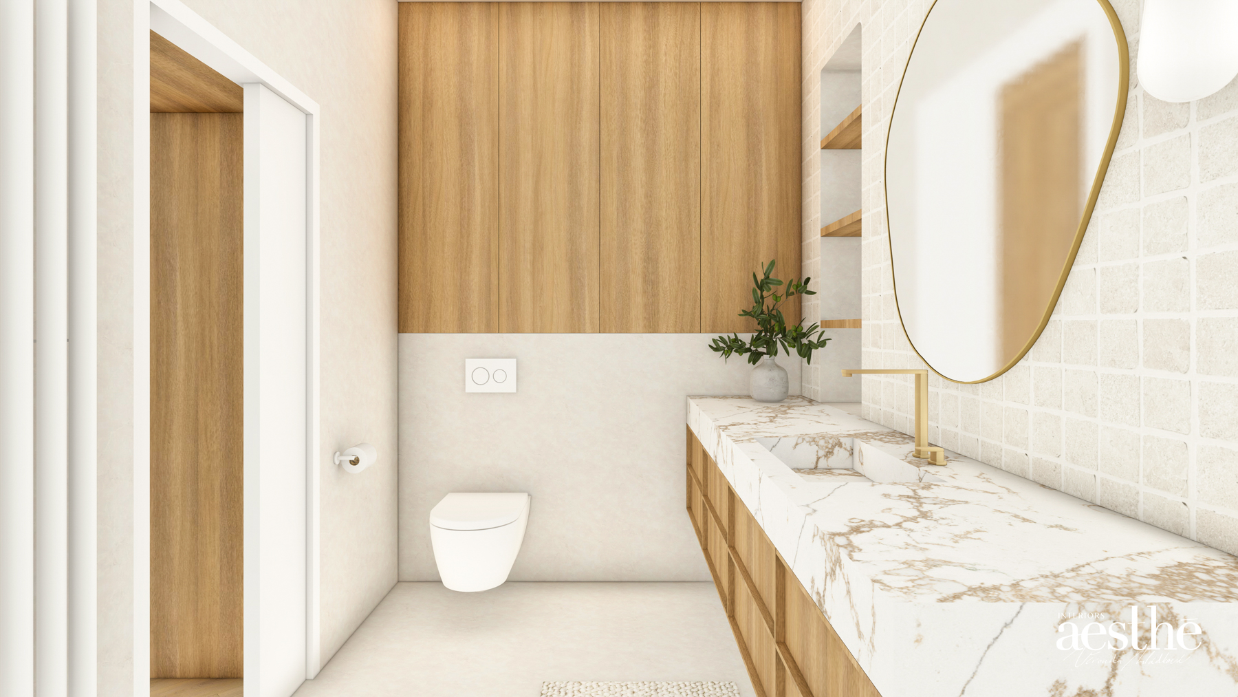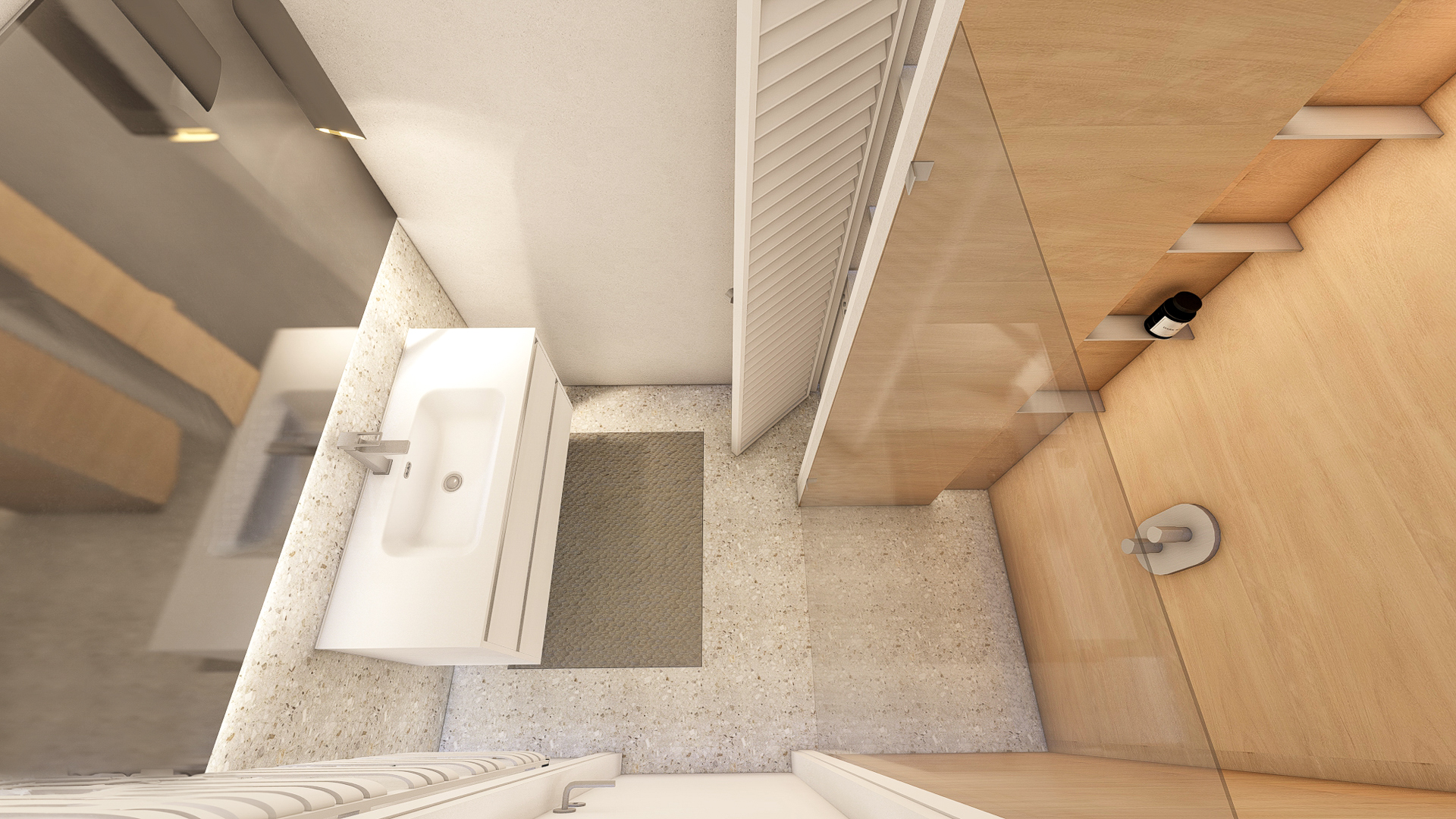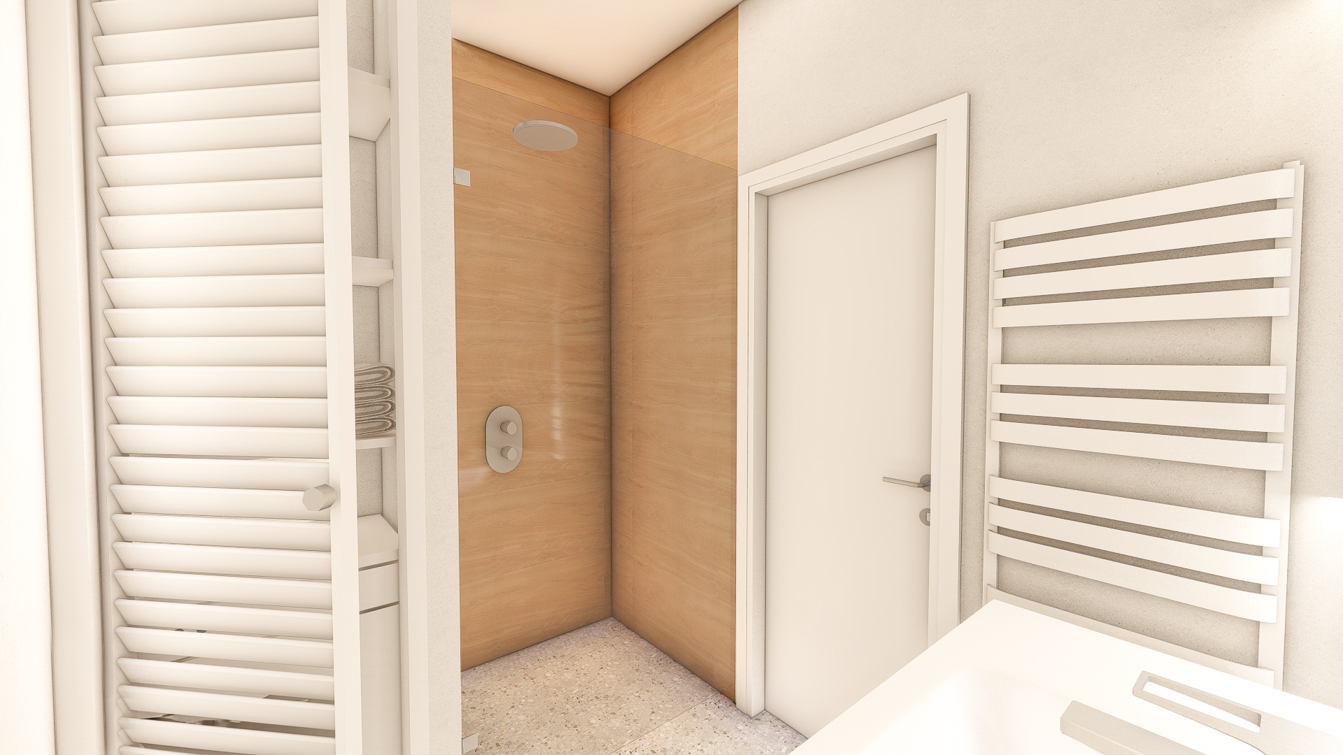 Do maličké koupelny, která měří pouze 1,5×1,8 m se podařilo poskládat vše potřebné, a to včetně pračky, která se sem v původním stavu nevešla. Pro maximální využití a optické zvětšení už tak malého prostoru jsem navrhla koupelnové skříňky na míru a barevnou stěnu, která prostor opticky rozšiřuje. Kromě barevného obkladu je zde moderní terazzo pro veselou atmosféru celé místnosti.