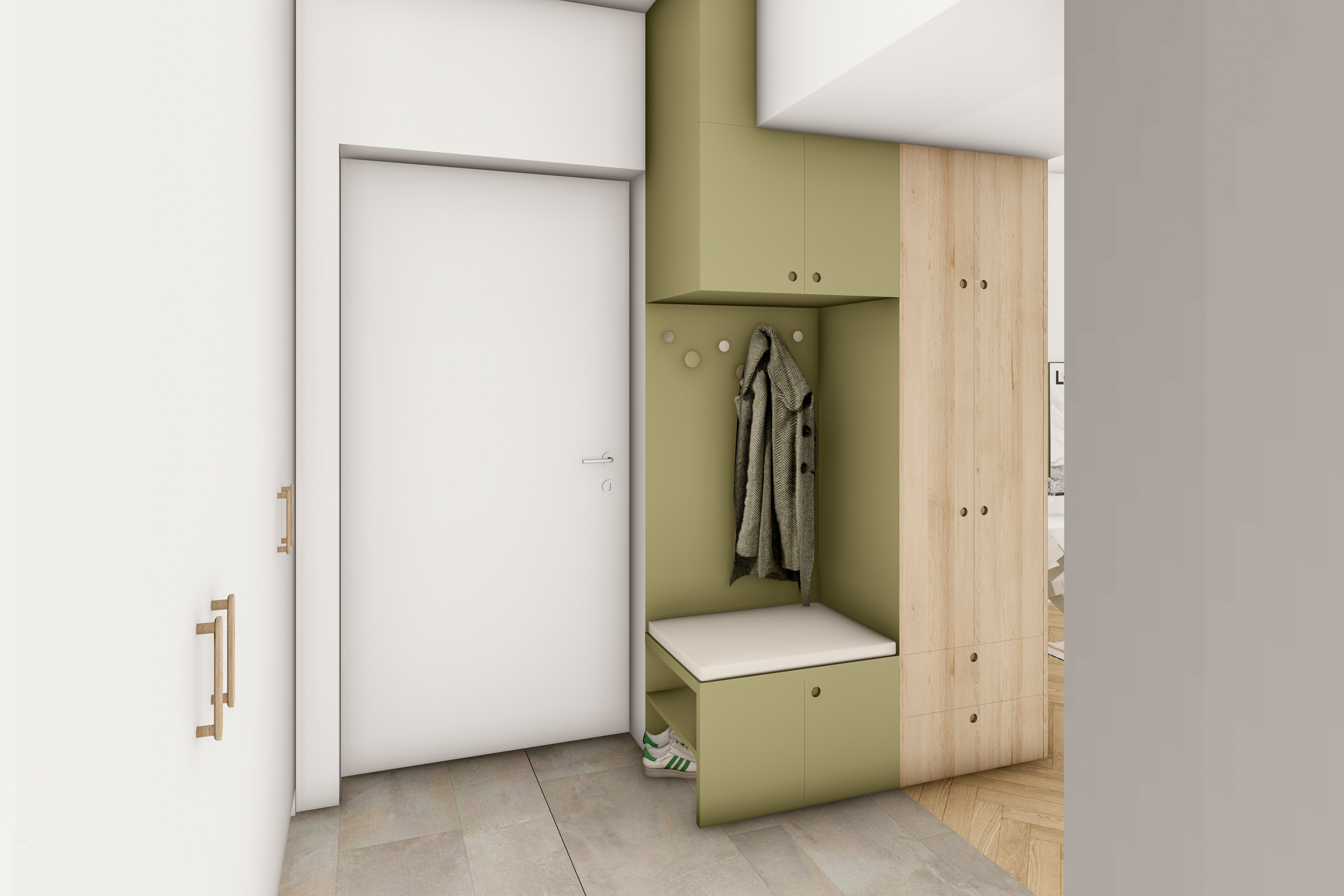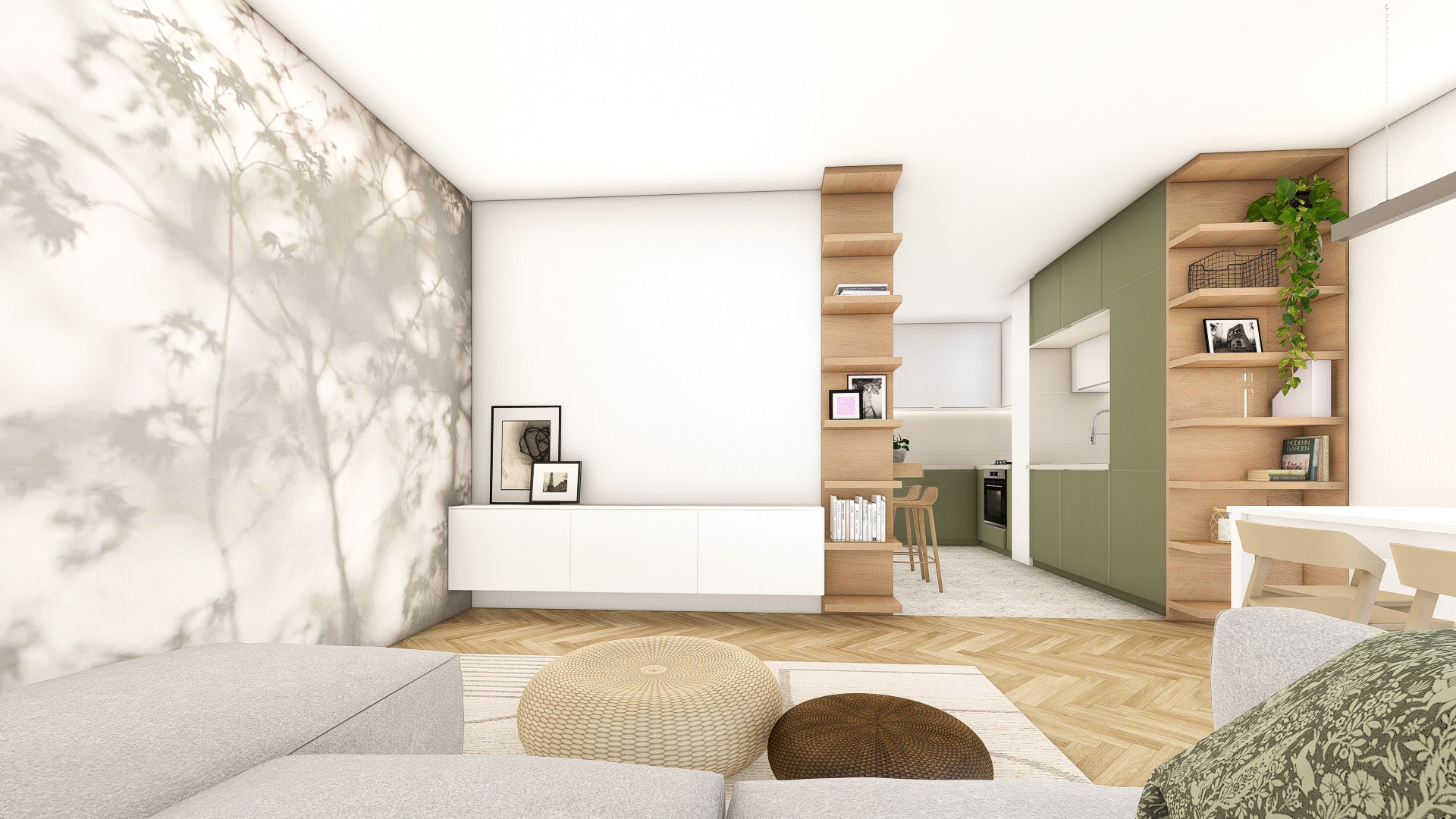 Pro mladou rodinu, která miluje přírodu byla navržena rekonstrukce bytu ze 70. let. Mínusem původní dispozice byla příliš dlouhá chodba a oddělená kuchyň se špatně využitelnými proporcemi. Při návrhu se kuchyň posunula směrem k obývacímu pokoji, čímž se využil konec chodby a zvětšil dětský pokoj. Dispozice bytu je tak nyní využita naplno.