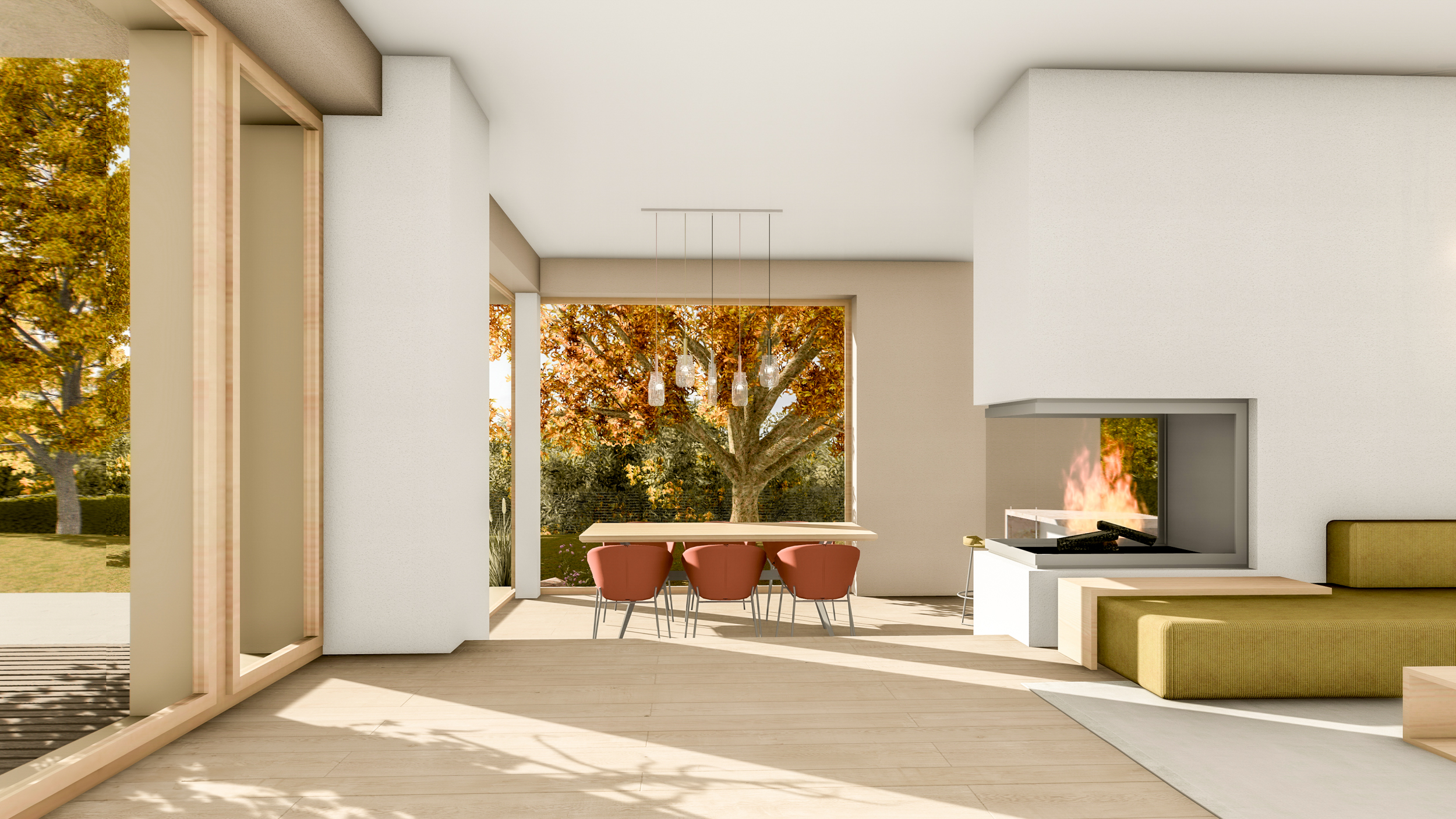 Interiér hraje teplými barvami a surovými materiály jako je dřevo a kámen, které dodávají celému prostoru luxusní dojem a reagují na přilehlý výhled do zahrady, který je hlavním prvkem celého prostoru.