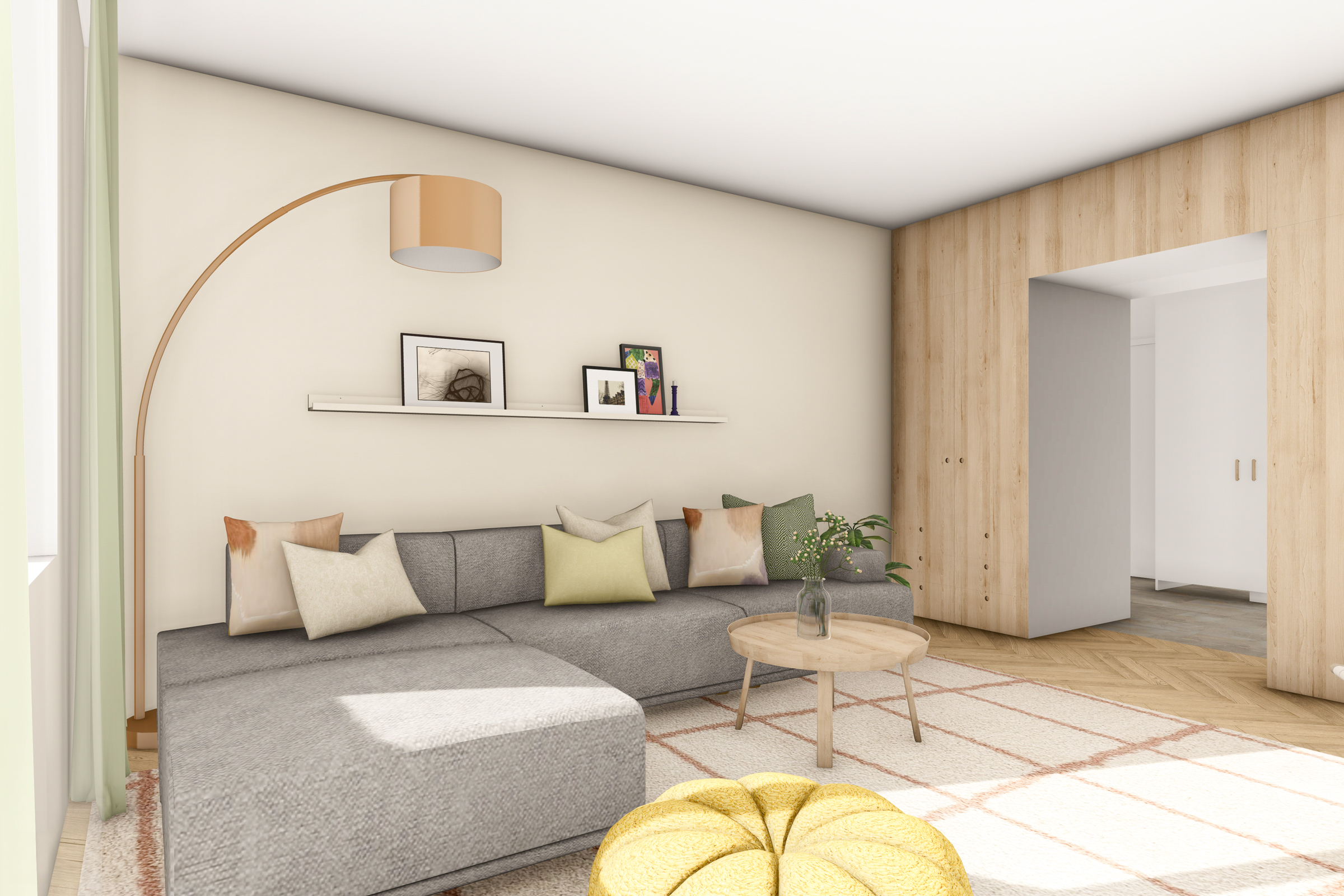 Tmavá chodba, spousta dveří a nejasná dispozice byly znakem původního stavu bytu 3+1. Díky zrušení dveří do obývacího pokoje vznikl moderní vzdušný prostor s dostatkem přirozeného světla. Celá dispozice je nyní lépe čitelná a výrazně se usnadnil přístup do kuchyně. Důraz byl kladen také na dostatek úložných prostor a míst k sezení a odpočinku.